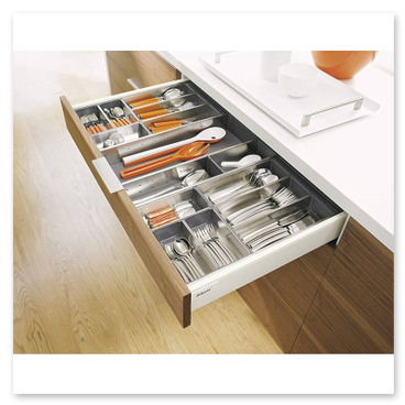 - Soluzioni salvaspazio: angoli, colonne estraibili, cassetti attrezzati, zoccoli contenitori.